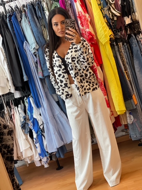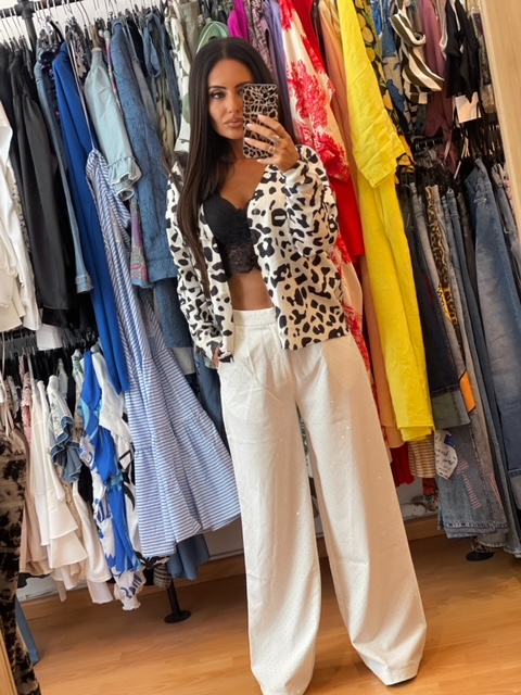• Περιγραφή: Κλασσικό Λευκό παντελόνι με στρας σε ίσια γραμμή. Κουμπώνει με φερμουάρ, κόπιτσα και εσωτερικό κουμπί στο μπροστινό μέρος. Διαθέτει τσέπες, μικρές πιέτες μπροστά και πένσες πίσω.