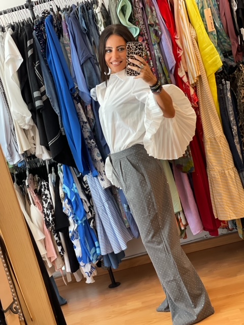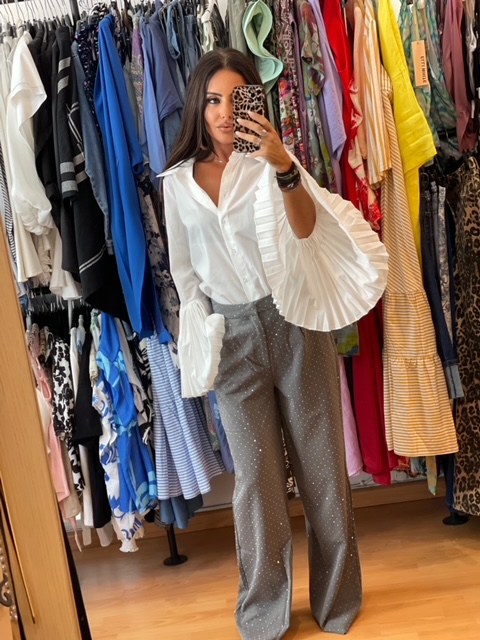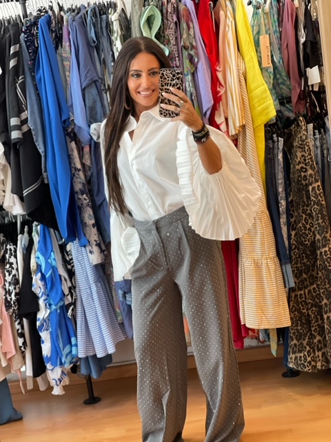- Περιγραφή: Κλασσικό Γκρι παντελόνι με στρας σε ίσια γραμμή. Κουμπώνει με φερμουάρ, κόπιτσα και εσωτερικό κουμπί στο μπροστινό μέρος. Διαθέτει τσέπες, μικρές πιέτες μπροστά και πένσες πίσω.