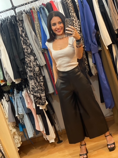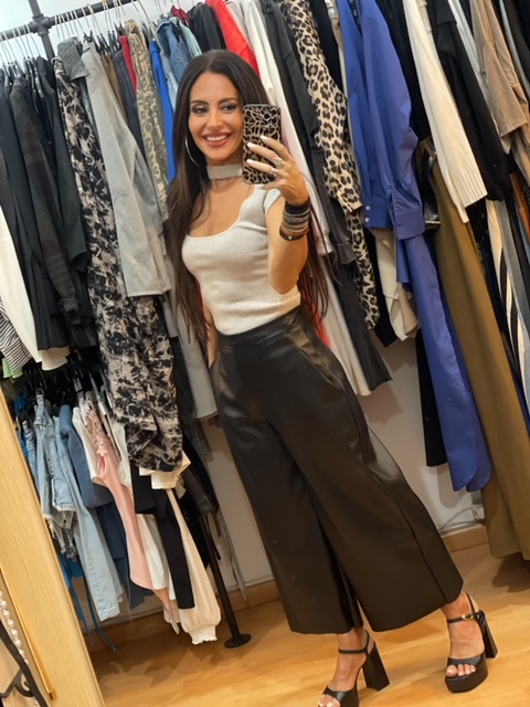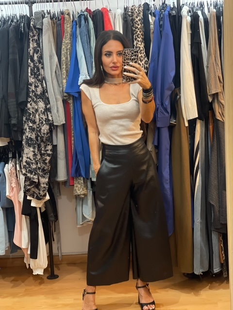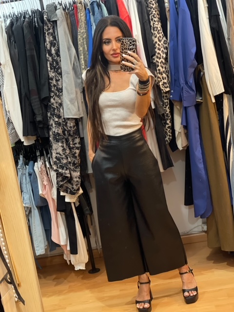 - Περιγραφή : Ψηλόμεση Κάπρι Eco Leather Μαύρη Wide Leg Παντελόνα. Διαθέτει τσέπες. Κλείνει με φερμουάρ στο πλάι. Περιφέρεια μέσης S έως 80εκ, M έως 85εκ, L έως 90 εκ.